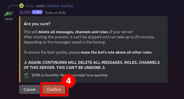 Nach der Bestätigung beginnt der SCNX-Bot mit dem Löschen aller existierenden Kanäle und Rollen deines Servers. Sobald das erledigt ist, wird der SCNX-Bot anfangen, deine Daten wiederherzustellen. Das kann bis zu 20 Minuten oder länger dauern. Sobald alles erledigt ist, erwähnt der SCNX-Bot-dich oder schreibt dir eine PN. Sollte irgendein Fehler auftreten, wird er das auch tun.