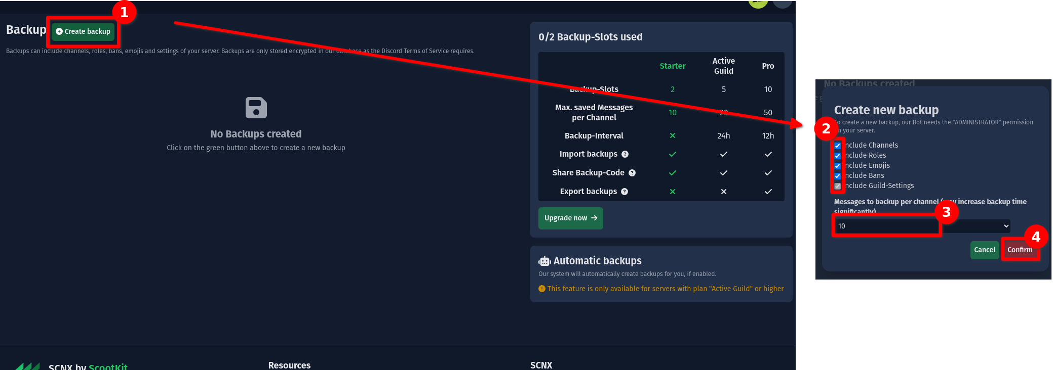 Um diese Funktion zu verwenden, musst du den SCNX-Bot auf deinen Server einladen. Einige Funktionen benötigen ein separate erwerbliches Backups+-Abonnent.