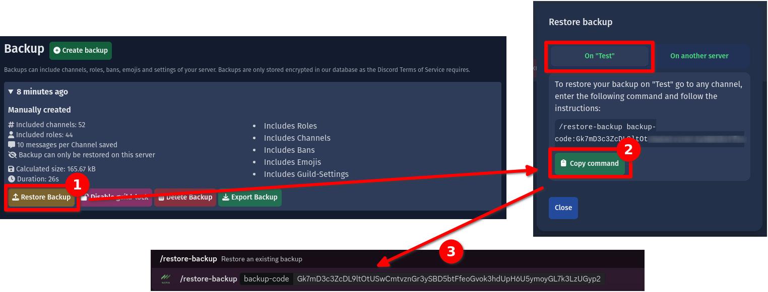 Um ein Backup auf deinem Server wiederherzustellen, öffne das Backup-Dashboard deines Servers und klicke auf das Backup, das du wiederherstellen möchtest. Als nächstes klicke auf "Backup wiederherstellen". Dir wird ein Befehl angezeigt werden. Kopiere ihn mit dem "Befehl kopieren" Knopf und füge ihn in deinem Server ein. Stelle sicher, dass du den Befehl mit dem (verifizierten) SCNX-Bot ausführst.